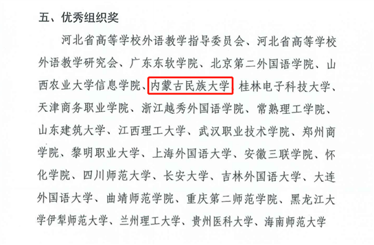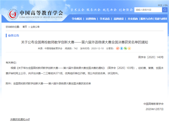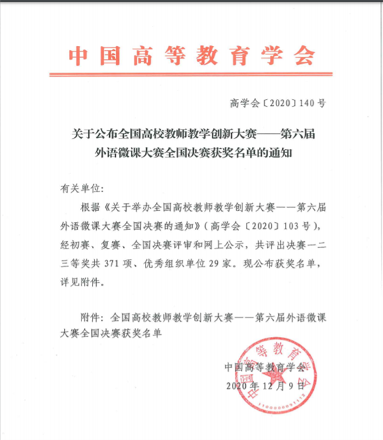 2020年全国高校教师教学创新大赛——第六届中国外语微课大赛经初赛、复赛、全国决赛评审和网上公示,于近日落下帷幕。我校外国语学院贾鸿丽、穆晓岩、胡晓莹、汪世纪、王明月5名教师荣获决赛三等奖,我校被评为优秀组织单位。