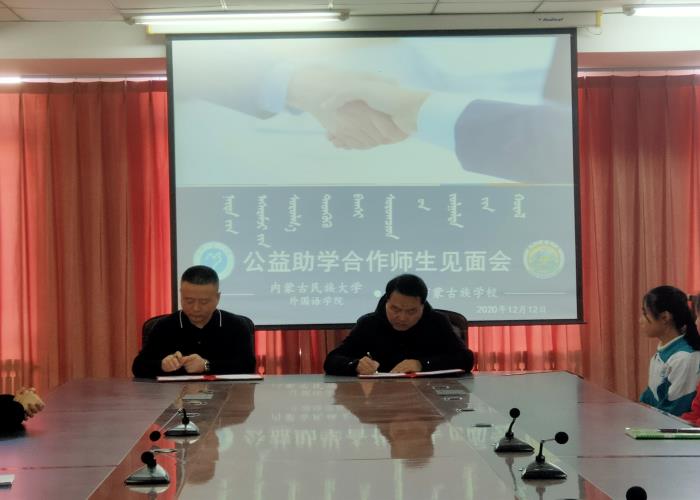 12月13日,外国语学院与通辽市蒙古族学校签订公益助学合作协议。外国语学院党总支书记孙研、英语系副教授龚斯琴、石榴籽工作室导师、蒙古族学校副校长韩立忠、教导处主任白乙拉、教师代表以及语露计划义教老师参加了本次会议。