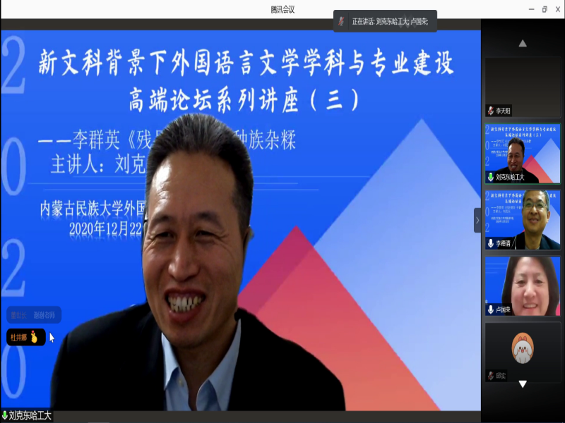 12月22日晚,外国语学院邀请哈尔滨工业大学外国语学院刘克东教授通过腾讯会议作了题为“李群英《残月楼》中的种族杂糅”的专场讲座。外国语学院全体教师和研究生、部分本科生线上聆听了讲座。本次讲座由党总支副书记李德清主持。