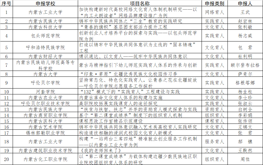 2020年12月28日,内蒙古自治区教育厅发布《关于公布2021年度高校思想政治工作项目计划的通知》,本次项目申报工作严格按照《内蒙古自治区教育厅关于做好2021年度高校思想政治工作项目申报工作的通知》要求,经过全区各高校推荐、专家评审、实地考察等方式,共评出69个全区高校思想政治工作项目,经过层层选拔和对比甄选,我校学生工作处处长白树全牵头申报的《“扶贫与扶智、扶志“并举的资助育人模式探索与实践》获得全区高校思想政治工作资助育人精品项目;医学院党总支书记赵宏林牵头申报的《铸牢中华民族共同体之“三生”教育实践研究》获得全区高校思想政治工作实践育人精品项目;外国语学院党总支书记孙研获得全区高校思想政治工作中青年骨干队伍建设项目;学生工作处大学生心理健康教育中心获得全区高校心理健康教育与咨询示范中心建设项目。 思想政治工作项目的入选,是我校长期紧紧围绕立德树人根本任务,坚持全面的育人体系建设的结果。学校将根据自治区教育厅要求,按照各项项目实施计划,扎实完成项目工作,形成具有可示范、可引领、可辐射、可推广、可持续意义的先进经验和典型做法,为学生成长成才服务,为全区高校思想政治工作体系建设提供助力。 5.全区高校心理健康教育与咨询示范中心建设项目公示名单 6.全区高校思想政治工作中青年骨干队伍建设项目公示名单