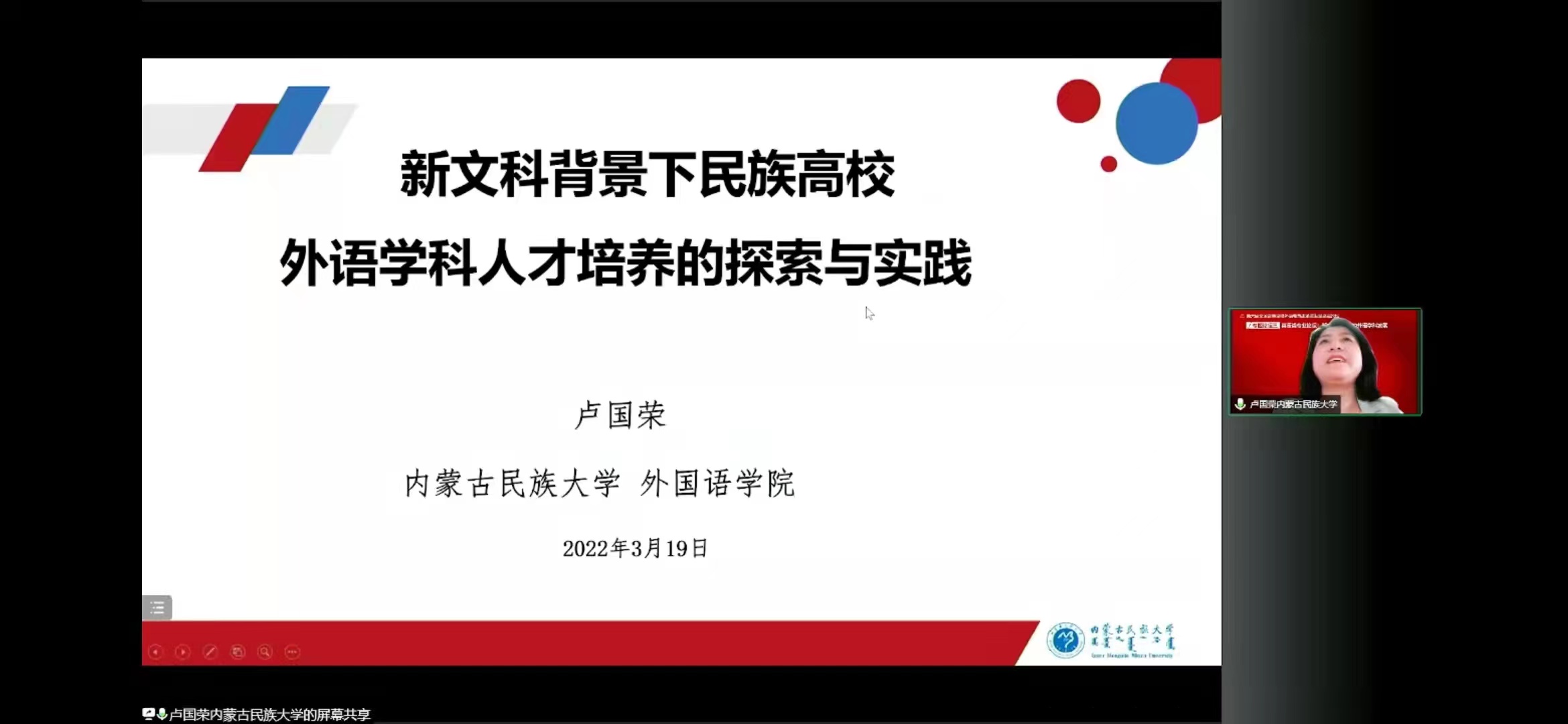 我院院长卢国荣教授应邀在专题论坛三上作了以《新文科背景下民族高校外语学科人才培养的探索与实践》为题的报告,提出外语教育要牢记“国之大者”, 落实立德树人根本任务,践行外语人的使命担当,向全国外语界同仁分享了我院主动服务“一带一路”建设,适应祖国北部边疆民族地区社会发展,在新文科指引下从学科建设、专业和课程建设、实践活动三个方面对人才培养做出的积极探索和实践。