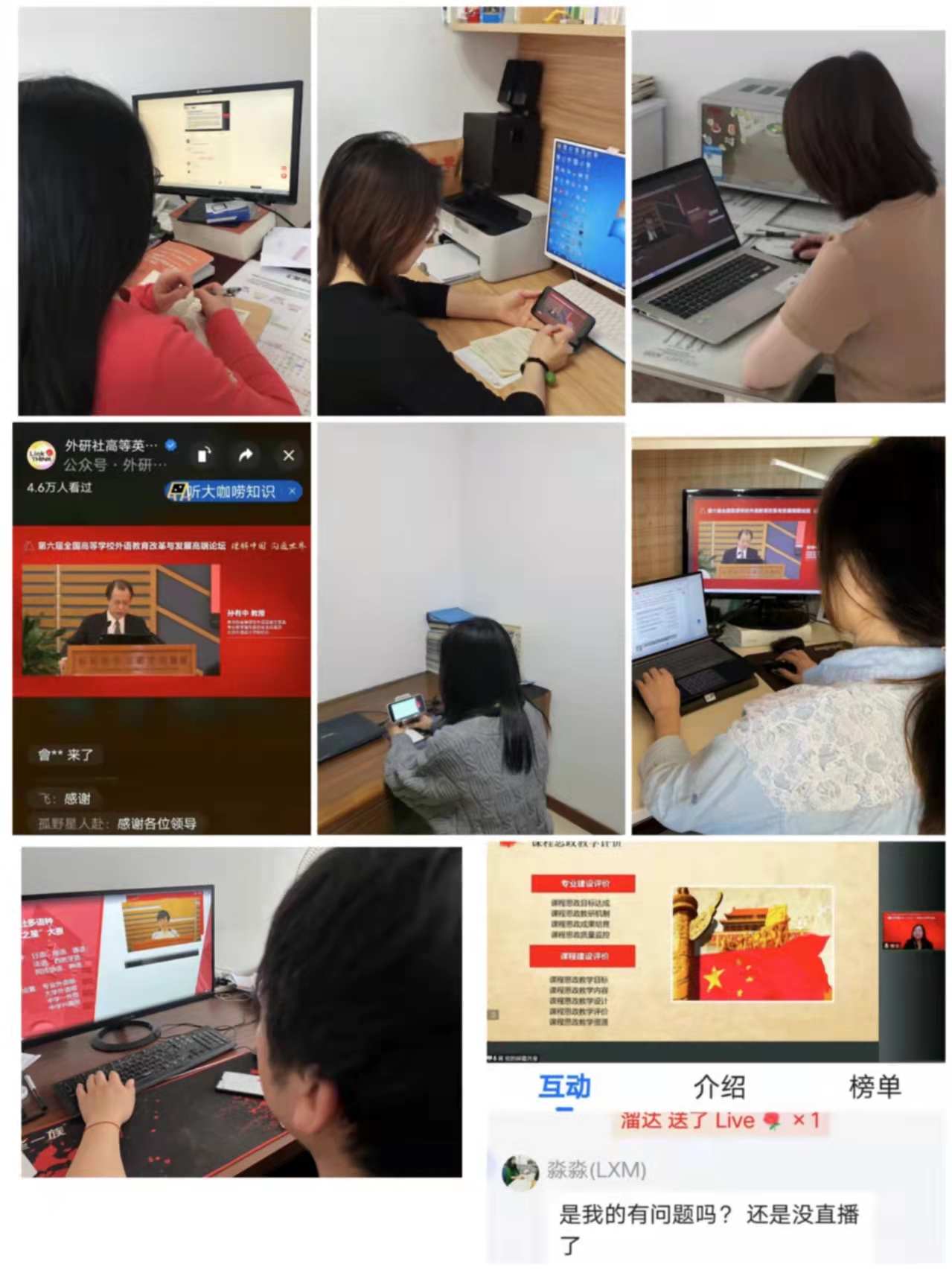 3月19、20日由北京外国语大学、教育部高等学校外国语言文学类专业教学指导委员会、教育部高等学校大学外语教学指导委员会与中国高等教育学会外语教学研究分会联合主办的“第六届全国高等学校外语教育改革与发展高端论坛”通过线上平台全程直播,本届论坛主题为“理解中国 沟通世界”。外国语学院积极组织学院全体教师参会观看直播。