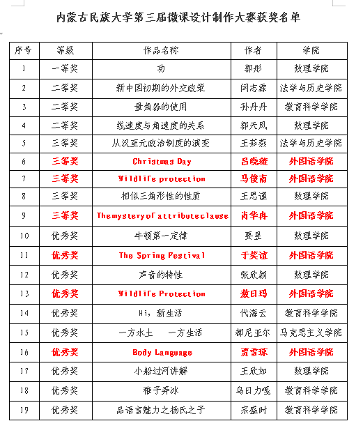 比赛中,英语教育教研室组织院内专家从设计思路、内容讲解、视频制作等方面对提交的14项作品进行了评审。最终,19级英语3班吕晓璇和18级英语4班马俊南获得一等奖,19级英语4班敖日玛、贾雪琼获得二等奖,其他参赛学生获得优秀奖。经过学院比赛后,将获奖作品提交至学校,参加“内蒙古民族大学第三届微课设计制作大赛”。