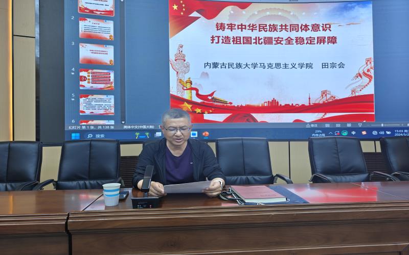 田宗会教授从深刻认识中华民族多元一体格局形成的历史过程、全面准确认识把握中央民族工作会议精神、准确把握世界百年未有之大变局面临的机遇和挑战、铸牢中华民族共同体意识的重大意义和实践要求四个方面进行了全面、深入、系统地讲解。他指出,要贯彻落实好习近平总书记关于加强和改进民族工作的重要思想和考察内蒙古时的重要指示精神,深刻把握新时代民族工作的历史方位,牢牢把握铸牢中华民族共同体意识这条主线,牢固树立正确的国家观、历史观、民族观、文化观、宗教观,呵护好“模范自治区”崇高荣誉。