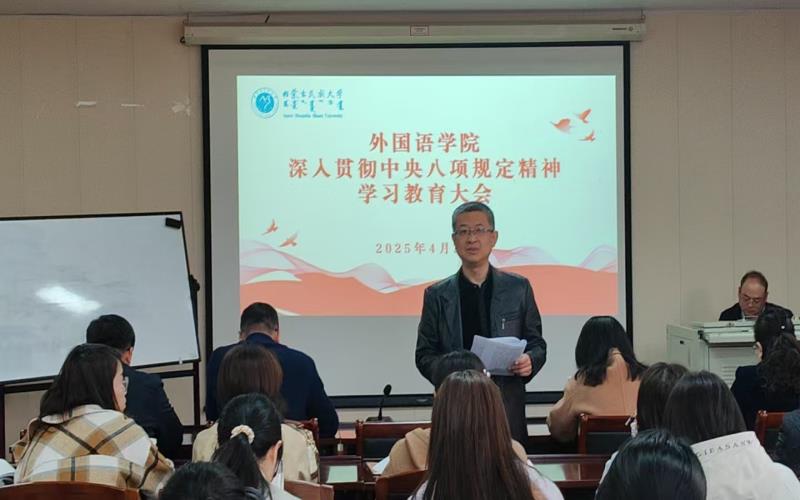4月2日下午,外国语学院在2041召开深入贯彻中央八项规定精神学习教育大会。学院党委书记李德清主持大会,学院党委全体成员、全体教职工党员及学生党员参会。