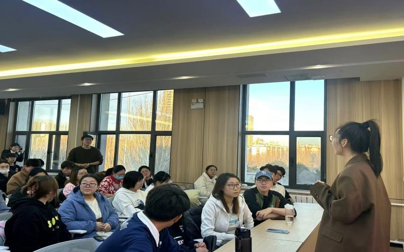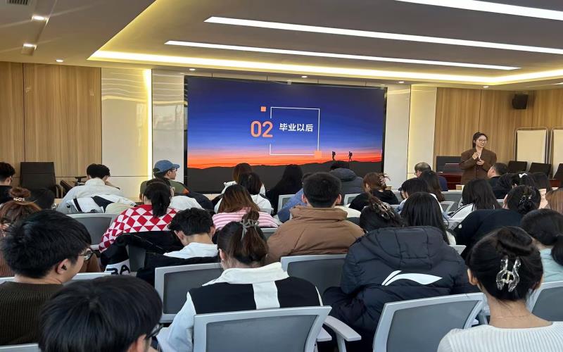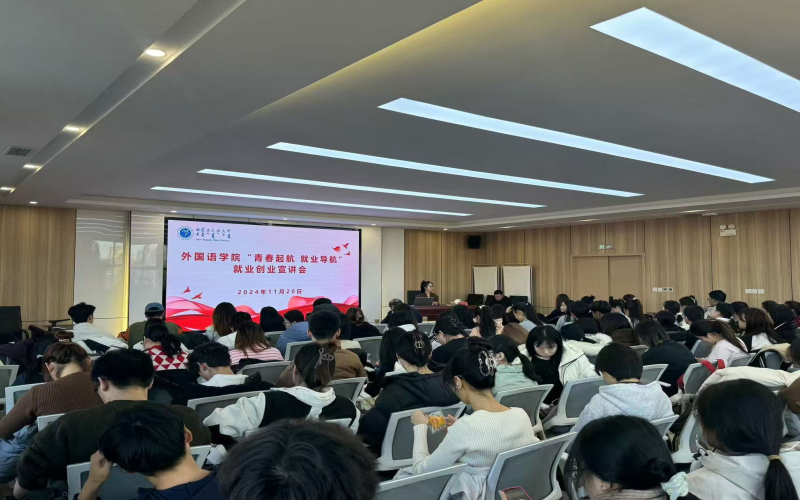 为全力促进2025届毕业生更充分、更高质量就业,11月20日下午,我院在大学生“一站式”服务件心314会议室举办“青春启航,就业导航”校友就业宣讲会。邀请鸿飞教育咨询有限公司董事长、外国语学院2011届英语专业毕业生韩雪进行宣讲,外国语学院党委副书记赵金文、团总支书记高海泉及外国语学院2025届毕业生100余人参加宣讲会。会议由团总支书记高海泉主持。