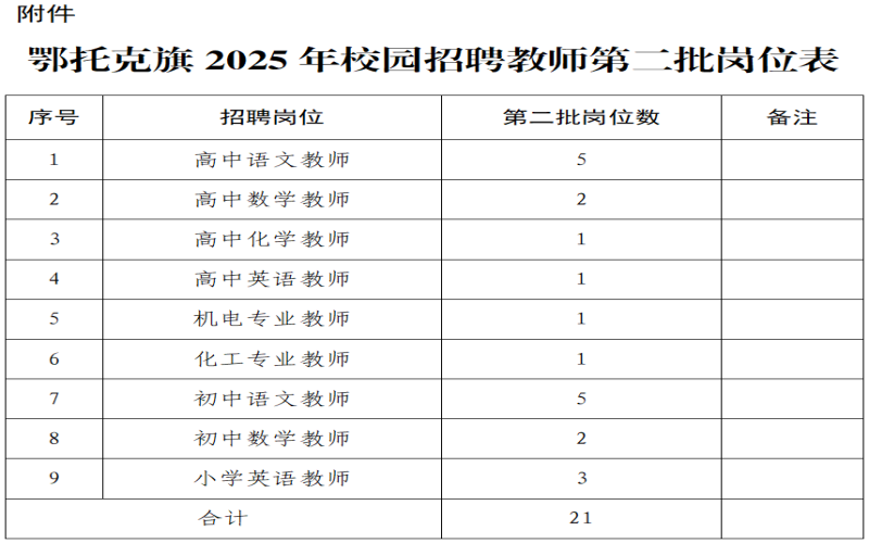 根据《鄂托克旗2025年校园招聘教师方案》要求,现将第二批校园招聘教师事宜通知如下: